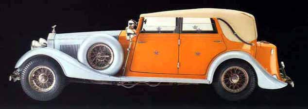 Rolls-Royce Phantom II Convertible 1934 K75Dieses Auto wurde 1934 als Sonderanfertigung für den rajkotischen Maharajah gebaut, um seinen 1908er "Silver Ghost" zu ersetzen. Dieses einmalige Torpedokabriolett wurde von Thrupp & Maberley, einem berühmten englischen Wagenbauer, konstruiert. Motorhaube und Stoßstangen sind aus glänzendem Aluminium, während das restliche Gehäuse safrangelb lackiert wurde, eine Farbe, die religiöse Bedeutung in Indien hat. Das Maharajahwappen befindet sich auf den Türen und Seitenfenstern und lautet "Dharm praja reja" (ein unparteiischer Herrscher von Menschen unterschiedlicher Glaubenskonfessionen). Das gekreuzte Rolls-Royce Wappen ist schwarz gefärbt, um Sir Henry Royce zu würdigen, der während der Bauzeit des Autos verstarb. Dieser berühmte Phantom II beteiligte sich an vielen Rallyes überall in Europa. Länge: 72 cm - Breite: 25 cm - Höhe: 24 cm - 2905 Einzelteile |